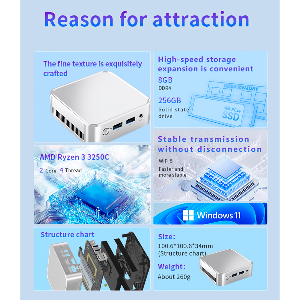Mini PC Kamrui AMD Ryzen R3-3250C com 8GB de Ram e 256GB SSD, Computador Compacto com Wifi 5 e Lan, 1x Saída Hdmi e DisplayPort Monitores, 4 Portas Usb A Design Silencioso para Estudo e Trabalho