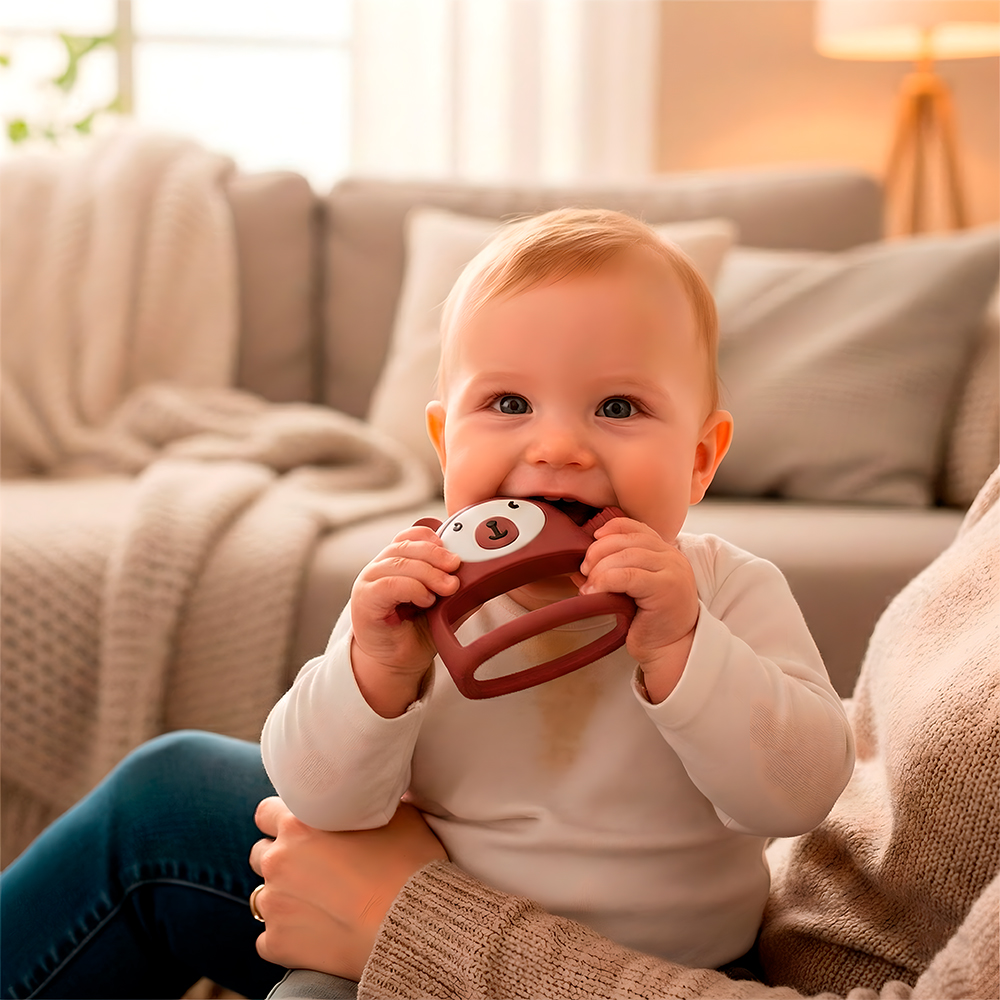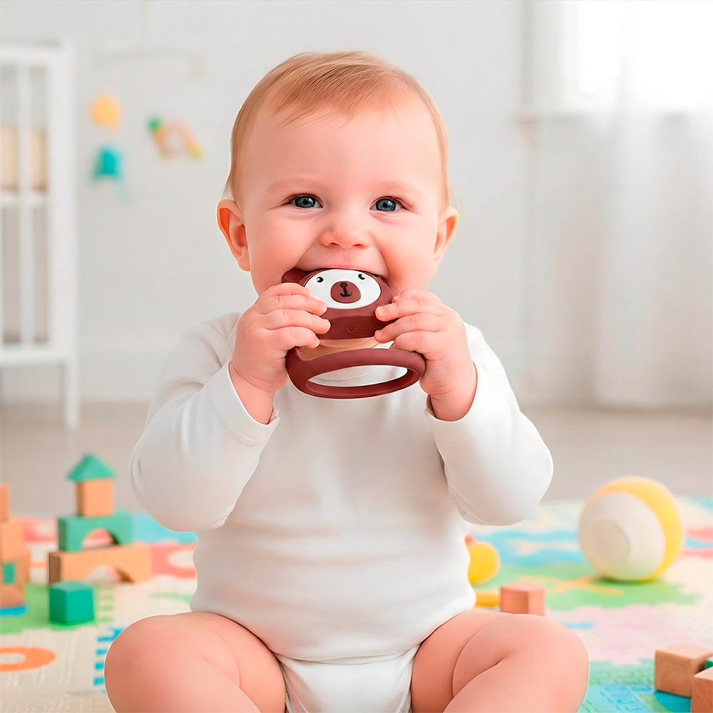 3. Design Ergonômico para o Pulso: Com um encantador formato de urso e encaixe perfeito no pulso, este mordedor para bebê evita quedas, mantendo-o sempre ao alcance das pequenas mãos. Facilita a auto-massagem da gengiva e estimula o desenvolvimento da coordenação motora.