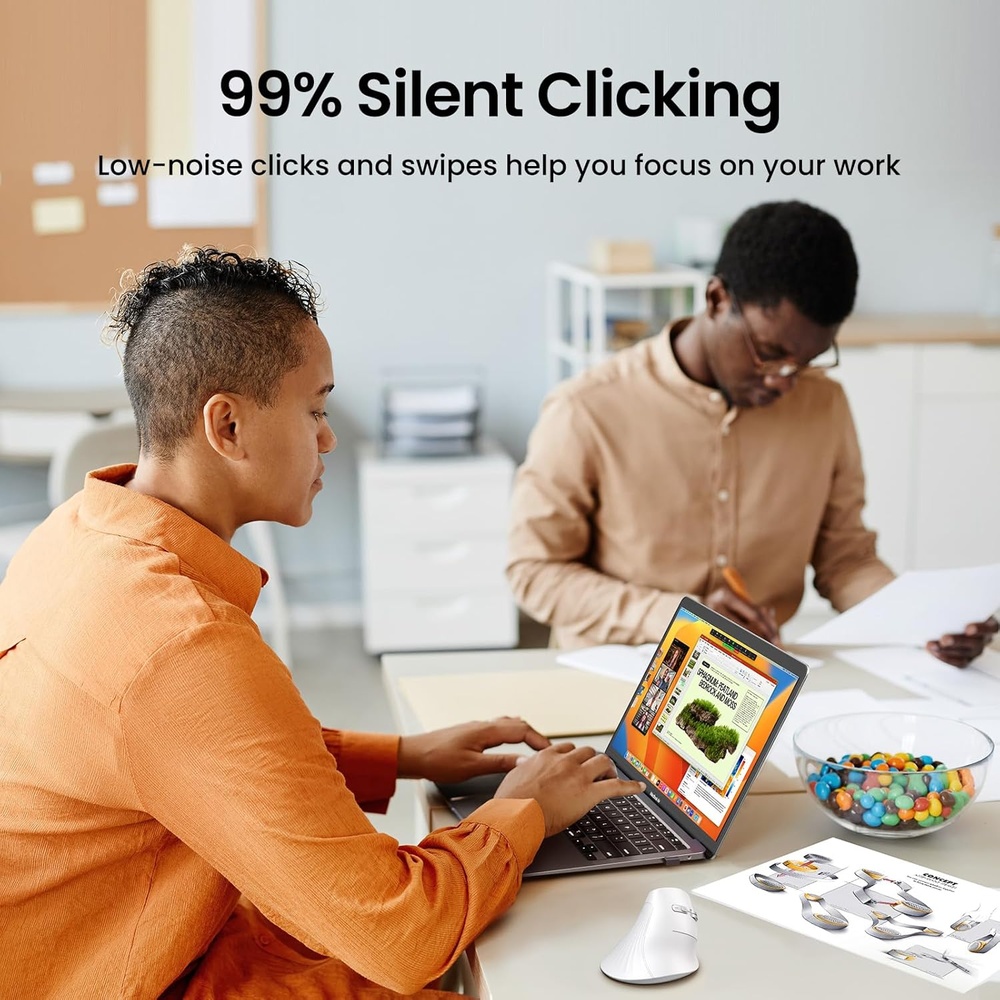 1. Design Ergonômico e Conforto: O Mouse Vertical Ugreen 45759 apresenta um formato projetado para seguir a curvatura natural da mão, assegurando uma pegada confortável e reduzindo a fadiga durante longas horas de uso. Seu ângulo vertical otimizado de 57° alinha a mão e o pulso em uma posição relaxada, minimizando a tensão.