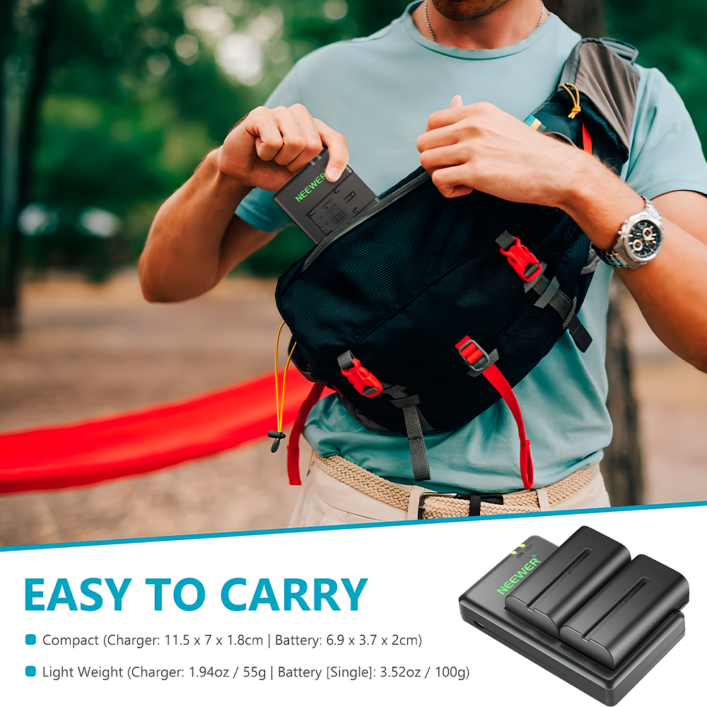 1. Kit Completo de Energia Neewer: O Neewer Kit Carregador Duplo LCD com 2 Baterias NP-F550 2600mAh oferece solução robusta para manter seus equipamentos fotográficos e de vídeo sempre prontos. Ideal para profissionais e entusiastas, garante horas extras de operação para câmeras, monitores de campo e painéis de iluminação LED que utilizam este padrão de bateria.