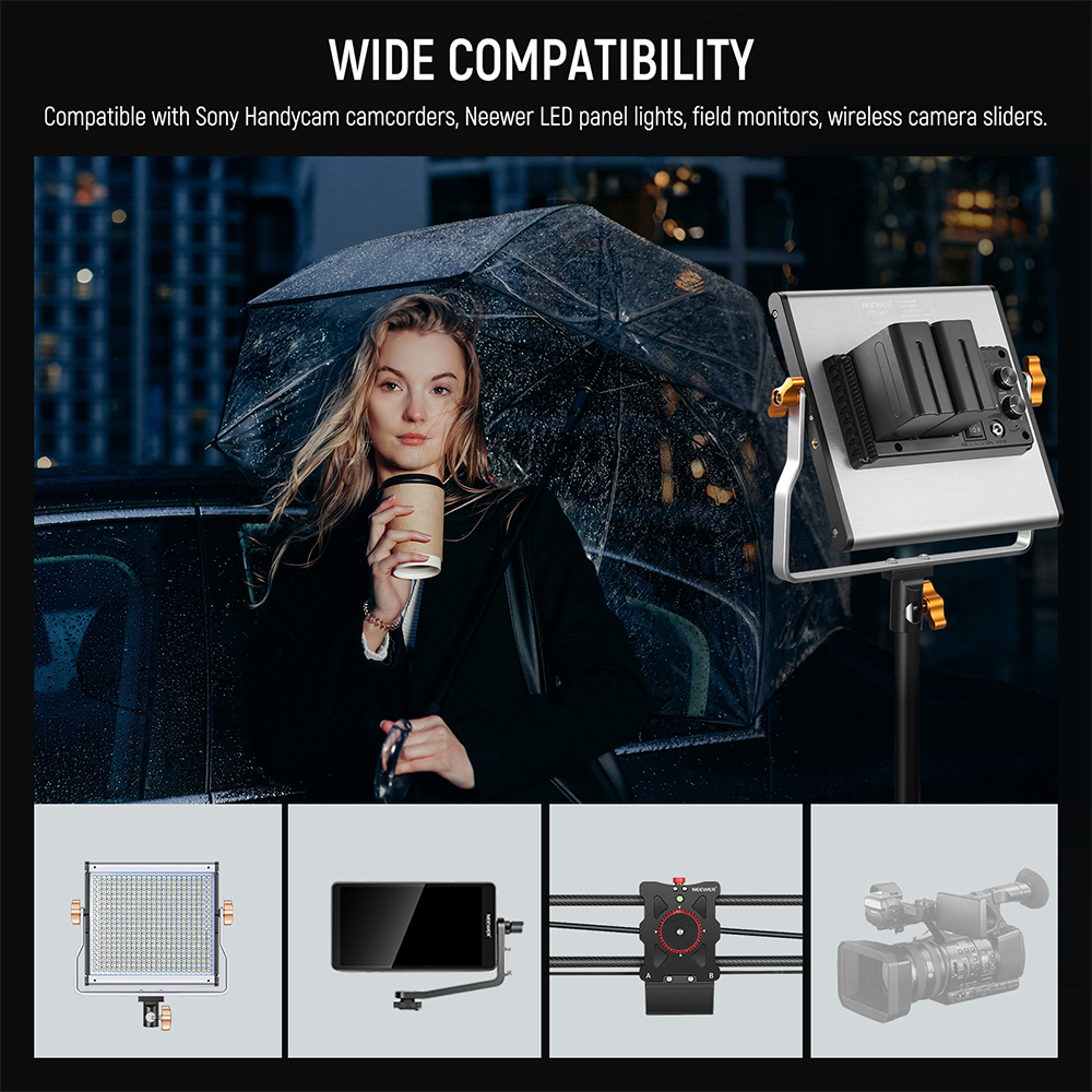 3. Baterias NP-F970 de Alta Capacidade 7800mAh: Inclui duas baterias NP-F970 Neewer 7800mAh, proporcionando longa duração e desempenho consistente. Ideais como substituição de baterias originais ou reposição para câmeras Sony, monitores de campo e iluminação LED, garantindo autonomia prolongada em projetos profissionais ou amadores.