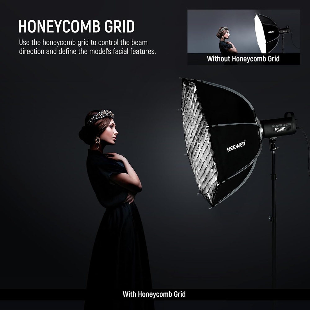 4. Grid colmeia incluso: direciona o feixe, reduz vazamento de luz e melhora o recorte do assunto, proporcionando controle criativo e resultados consistentes com luz contínua ou flash.