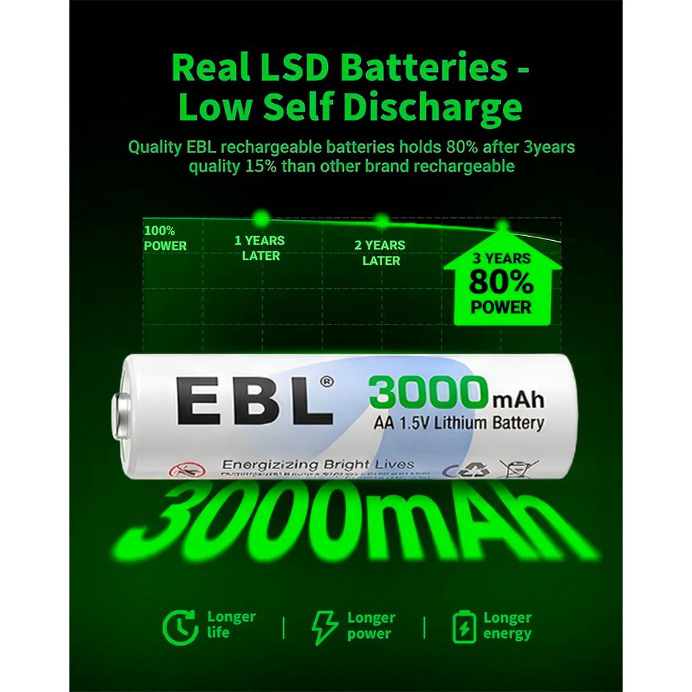 Com composição de lítio de alta densidade, as pilhas EBL AA não recarregáveis entregam tensão constante durante toda a vida útil. São perfeitas para equipamentos eletrônicos que necessitam de energia imediata, dispensando recargas e oferecendo praticidade no uso diário.