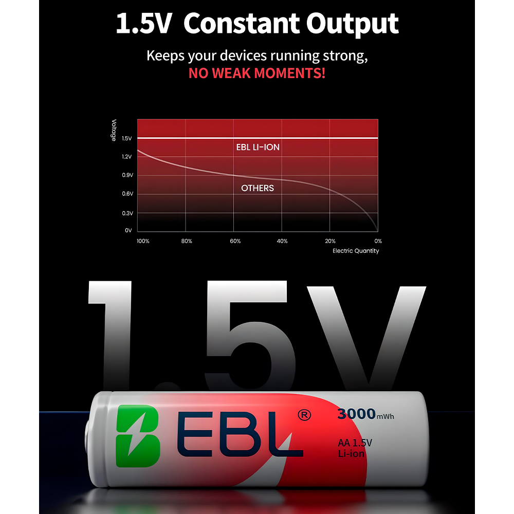 2. Alta Capacidade e Longa Duração (3000mWh): Cada bateria EBL oferece uma capacidade impressionante de 3000mWh, proporcionando uma fonte de energia robusta e duradoura. Perfeitas para dispositivos de alto consumo, estas pilhas recarregáveis mantêm a carga por períodos prolongados, otimizando o uso.