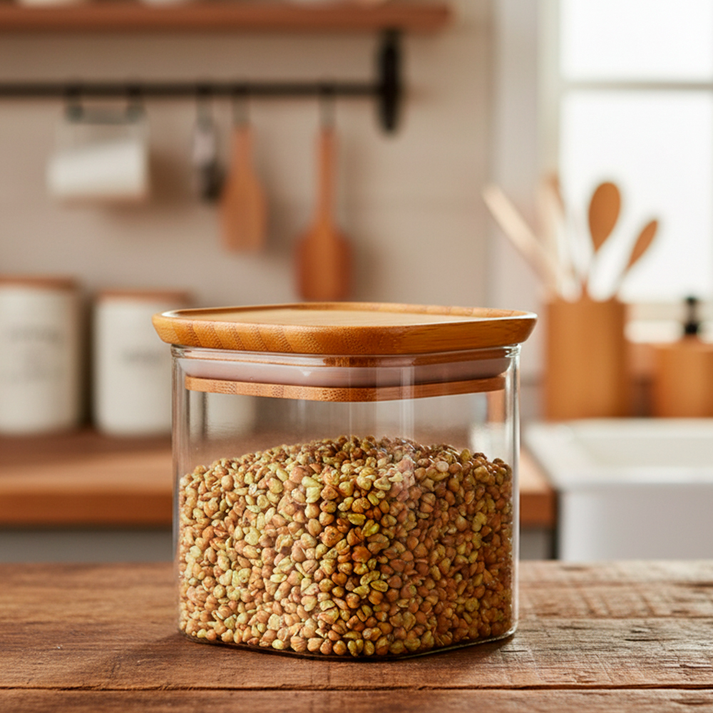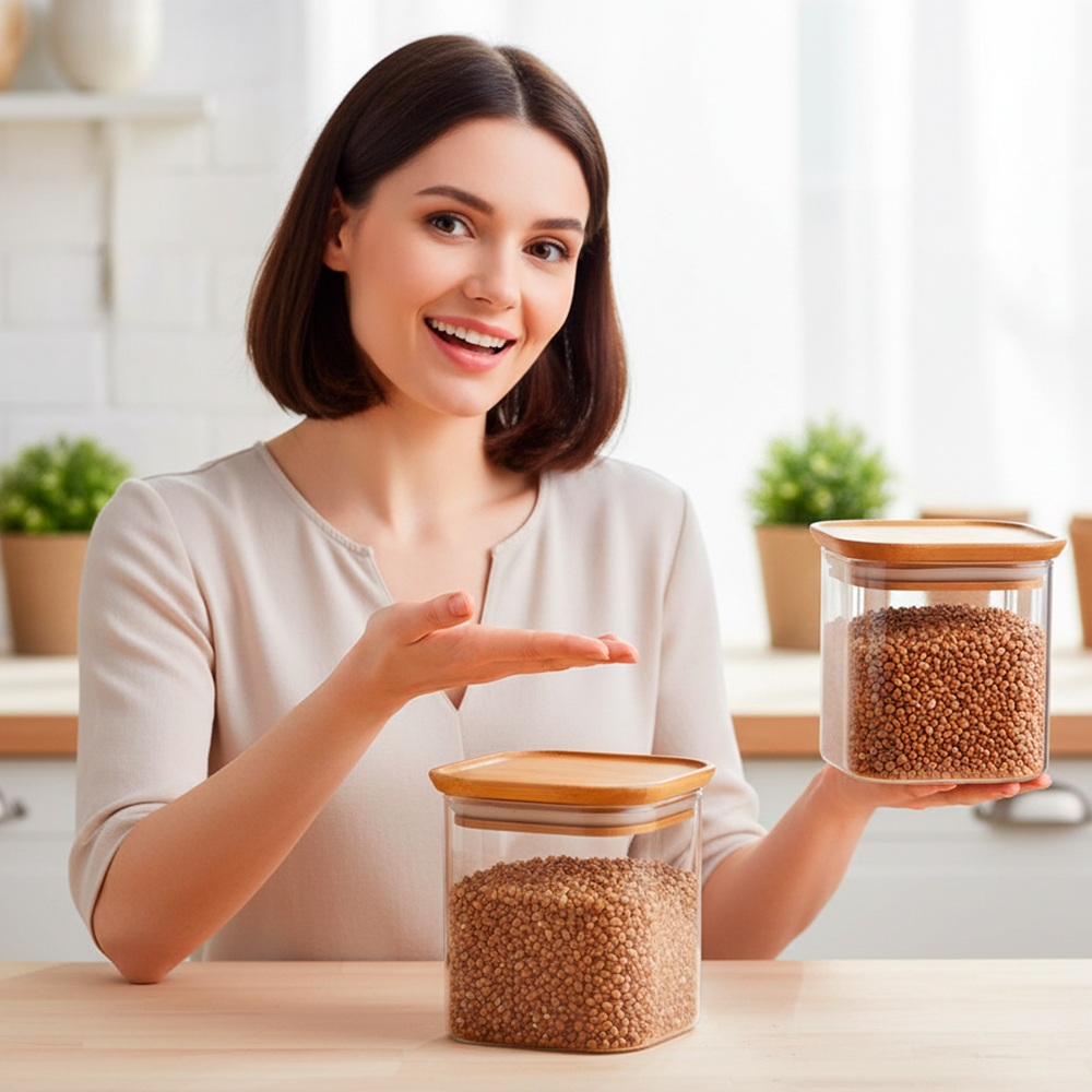 4. Design Elegante e Moderno: A combinação do vidro liso com a tampa de bambu natural confere a este pote um visual elegante e contemporâneo. Ele serve como uma solução prática de armazenamento e também adiciona um toque de sofisticação à decoração da sua cozinha ou despensa.