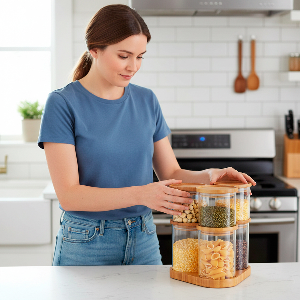 2. Vedação Hermética com Tampa de Bambu: Os recipiente possui uma tampa de bambu natural com um anel de vedação em silicone, que cria um fechamento hermético eficaz. Esta funcionalidade protege os alimentos da umidade e do ar, prolongando o frescor de produtos secos como farinha, açúcar, cereais e chás.