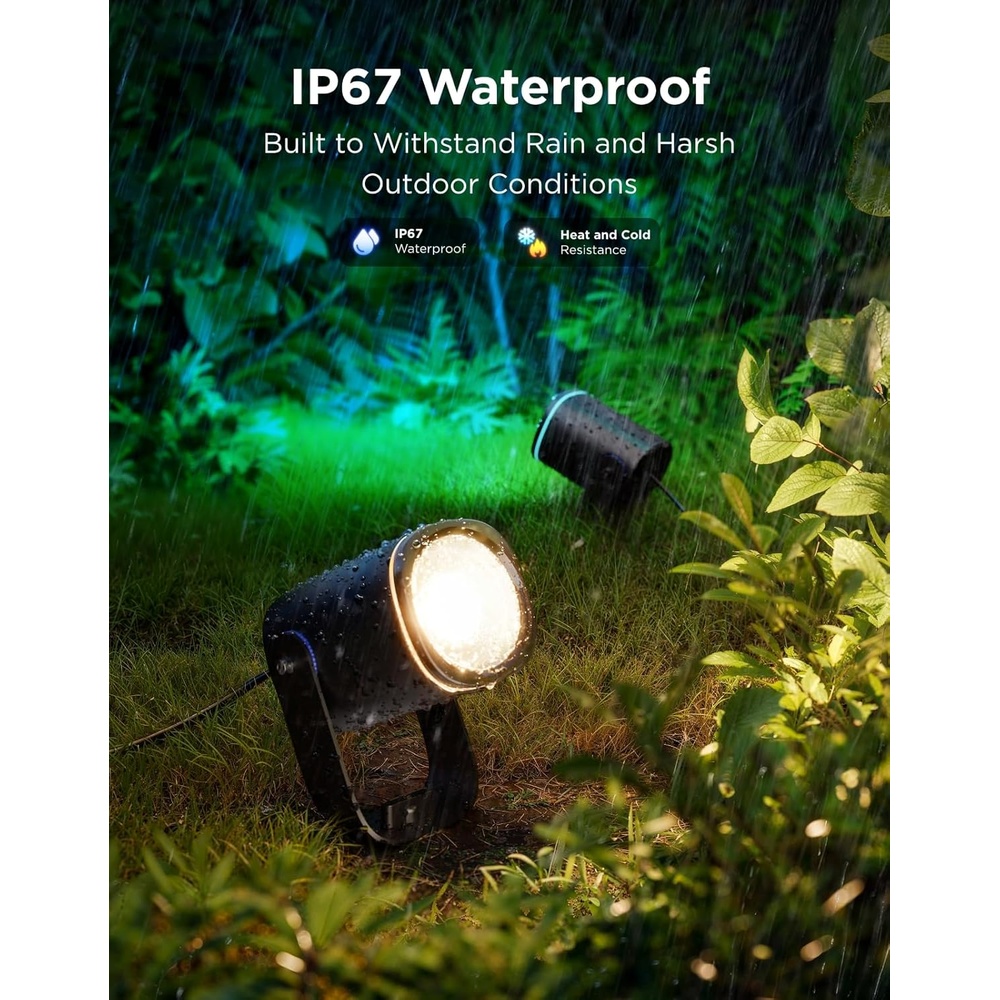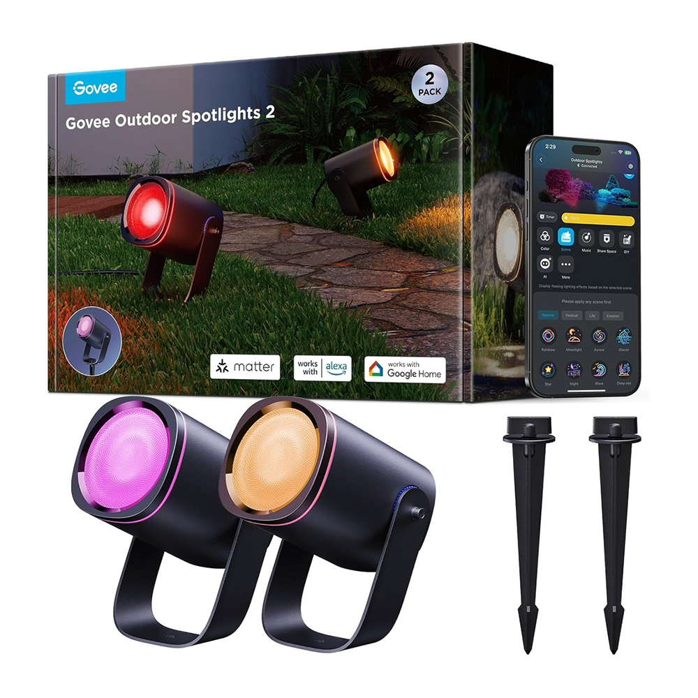 Refletores de Jardim Govee Matter RGBWIC com 2 Unidades, Holofote Externo Inteligente IP67 à Prova D’água, Controle por Voz Alexa e Google, 69 Modos de Cena e Estrutura em Alumínio