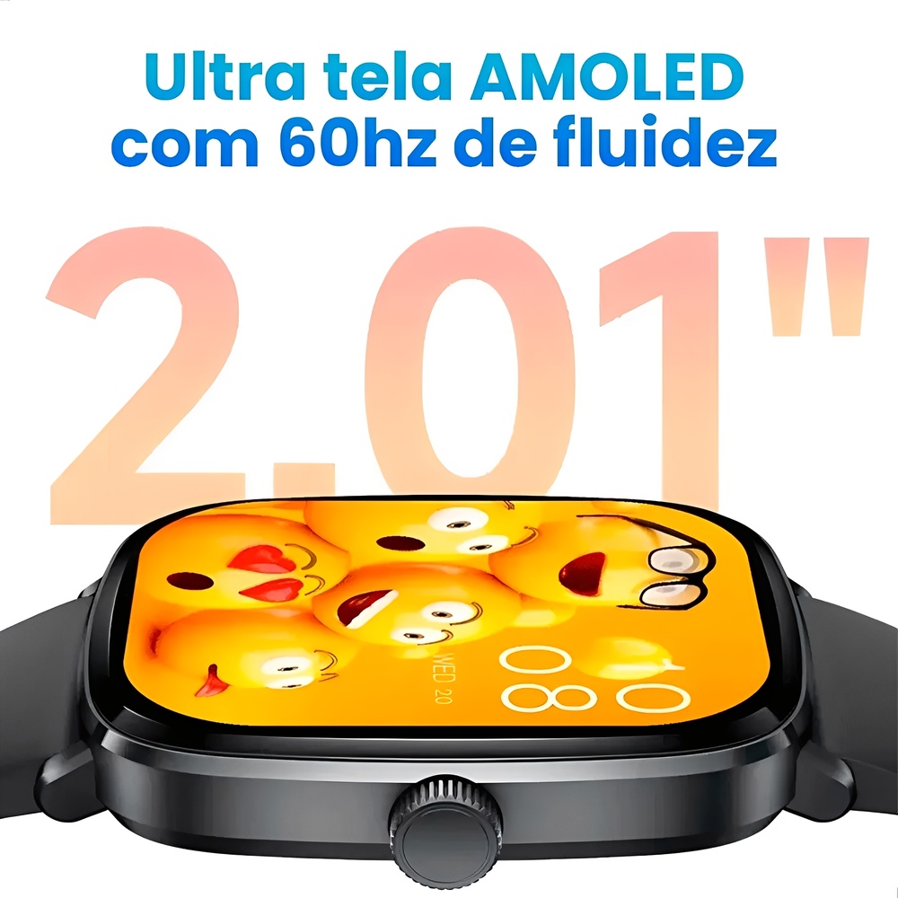 Com um design fino e leve, o smartwatch é perfeito para o uso diário, combinando estilo e conforto. A moldura metálica proporciona um toque elegante e moderno, ideal para quem busca um dispositivo funcional e com visual sofisticado.