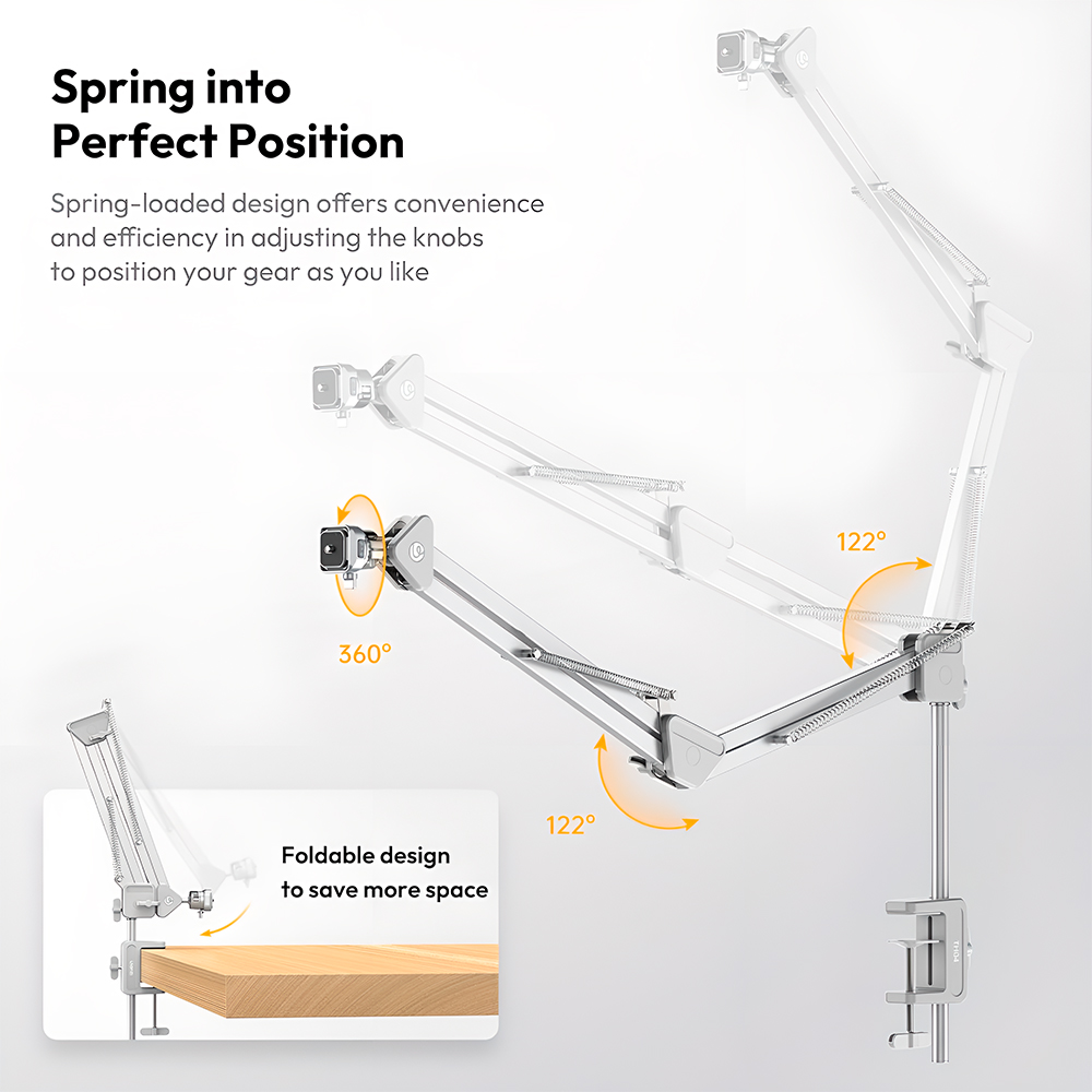4. Montagem Simples e Estável: Projetado para uma instalação descomplicada, este suporte de câmera é facilmente fixado em mesas ou bancadas de até 5cm de espessura através de um sistema de garra firme. Oferece uma base sólida e estável para sua câmera, eliminando tremores e garantindo gravações fluidas e profissionais.