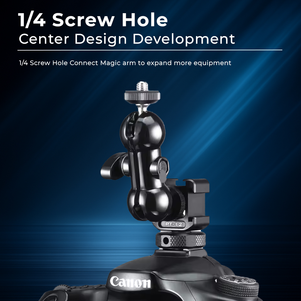 2. Compatível com sapata quente ou fria, o PT-12 é instalado diretamente na câmera e fixado com firmeza através de botão de aperto manual. Esse sistema garante estabilidade e segurança aos acessórios, mesmo em gravações ou fotografias em movimento.