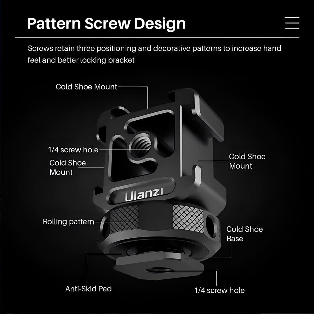 Suporte Triplo Cold Shoe Ulanzi PT-12 em Alumínio Aeronáutico, Compatível com Sapata Quente/Fria, para Montagem de Luz LED, Microfone, Monitor e Acessórios em Câmeras DSLR e Mirrorless
