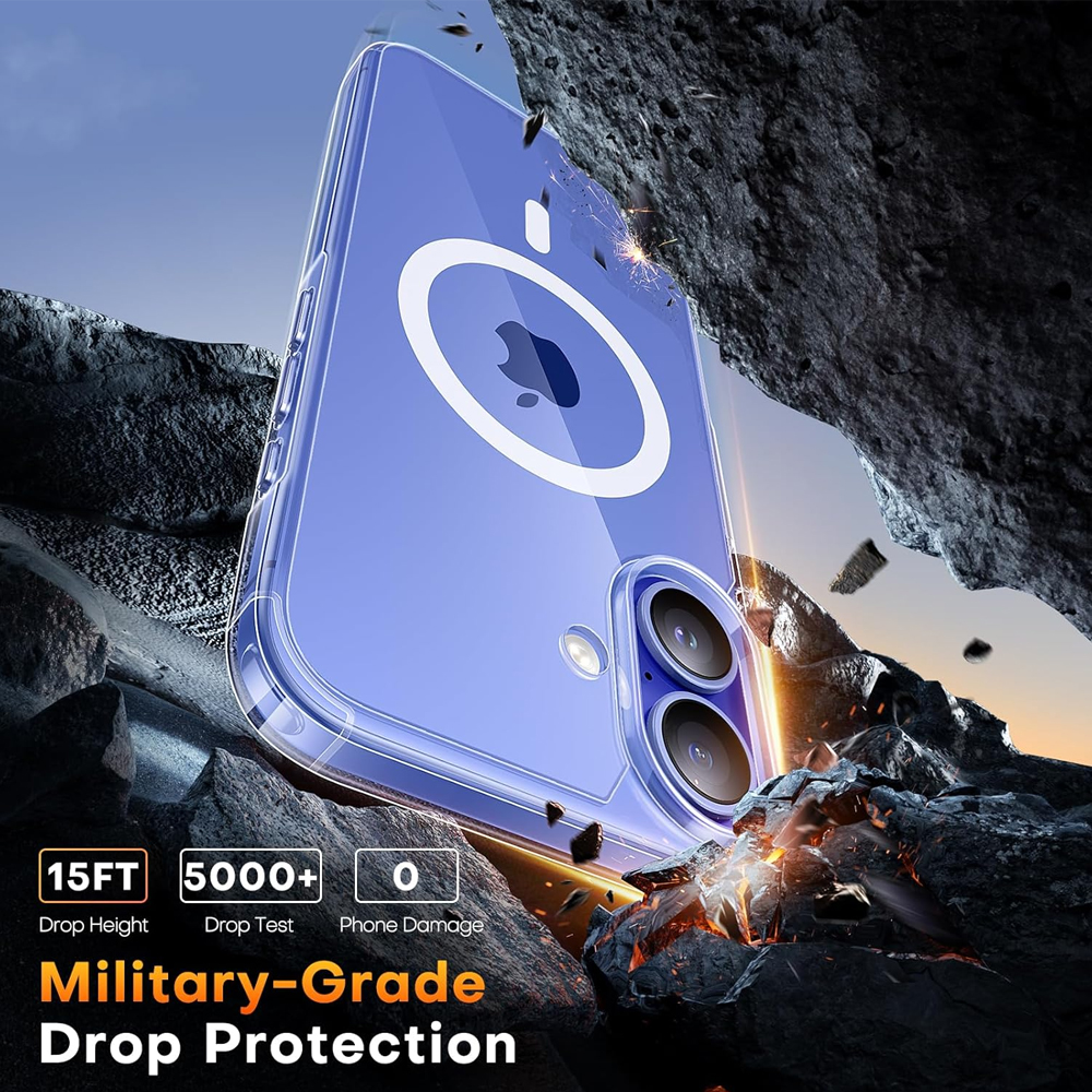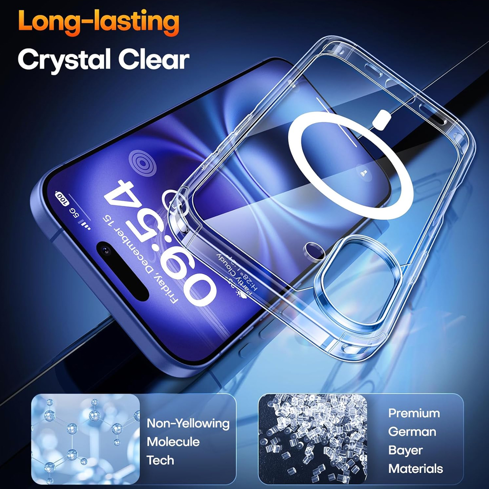 Capa TAURI Magnética para iPhone 16 Plus 6,7”, Proteção 360° com 2 Protetores Tela 9H, À Prova de Choque, Proteção de Nível Militar, Transparente e Antiamarelamento, Compatível com MagSafe