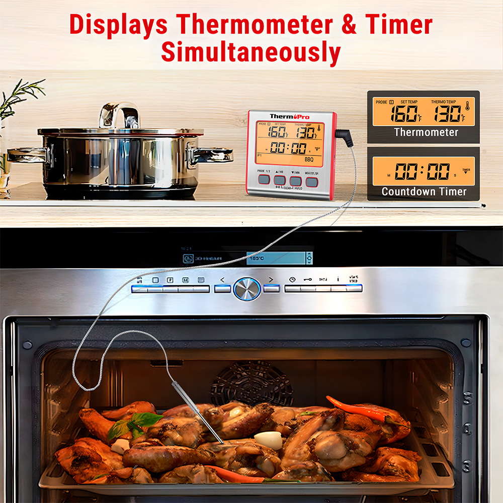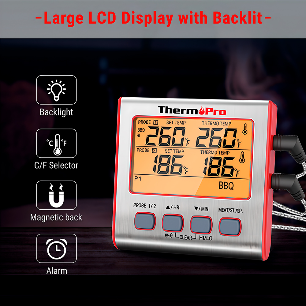 Termômetro Culinário Digital ThermoPro TP17W com Sonda Dupla para Carne, Churrasco, Forno e Assados. Medidor de Temperatura de Alimentos com Alarme e Timer Prata/Vermelho