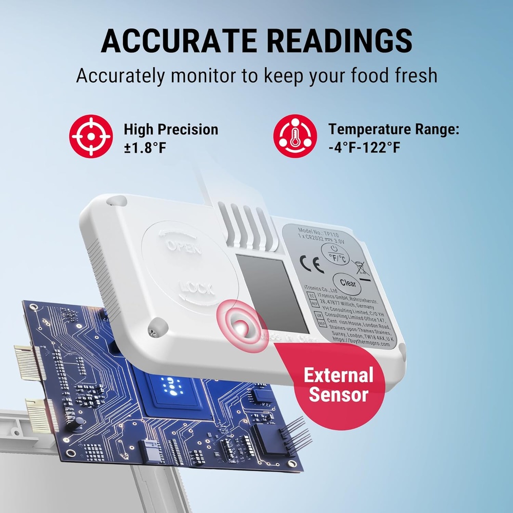 3. Leitura Rápida e Display Amplo: Projetado para sua comodidade, o display grande e de fácil leitura dos termômetros ThermoPro TP110 permite que você verifique as temperaturas rapidamente, sem esforço. Mantenha-se informado sobre as condições do seu refrigerador ou congelador em um piscar de olhos.