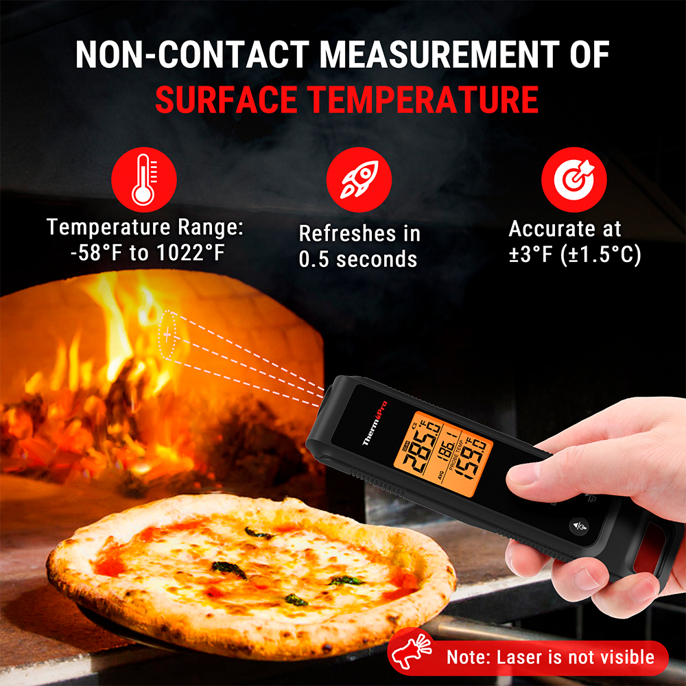 1. Tecnologia Híbrida 2 em 1 ThermoPro: Este modelo inovador combina a precisão de um sensor infravermelho para superfícies com uma sonda de inserção para o interior de alimentos, permitindo monitorar desde a temperatura de uma grelha ou forno de pizza até o ponto exato de preparo de carnes e líquidos.