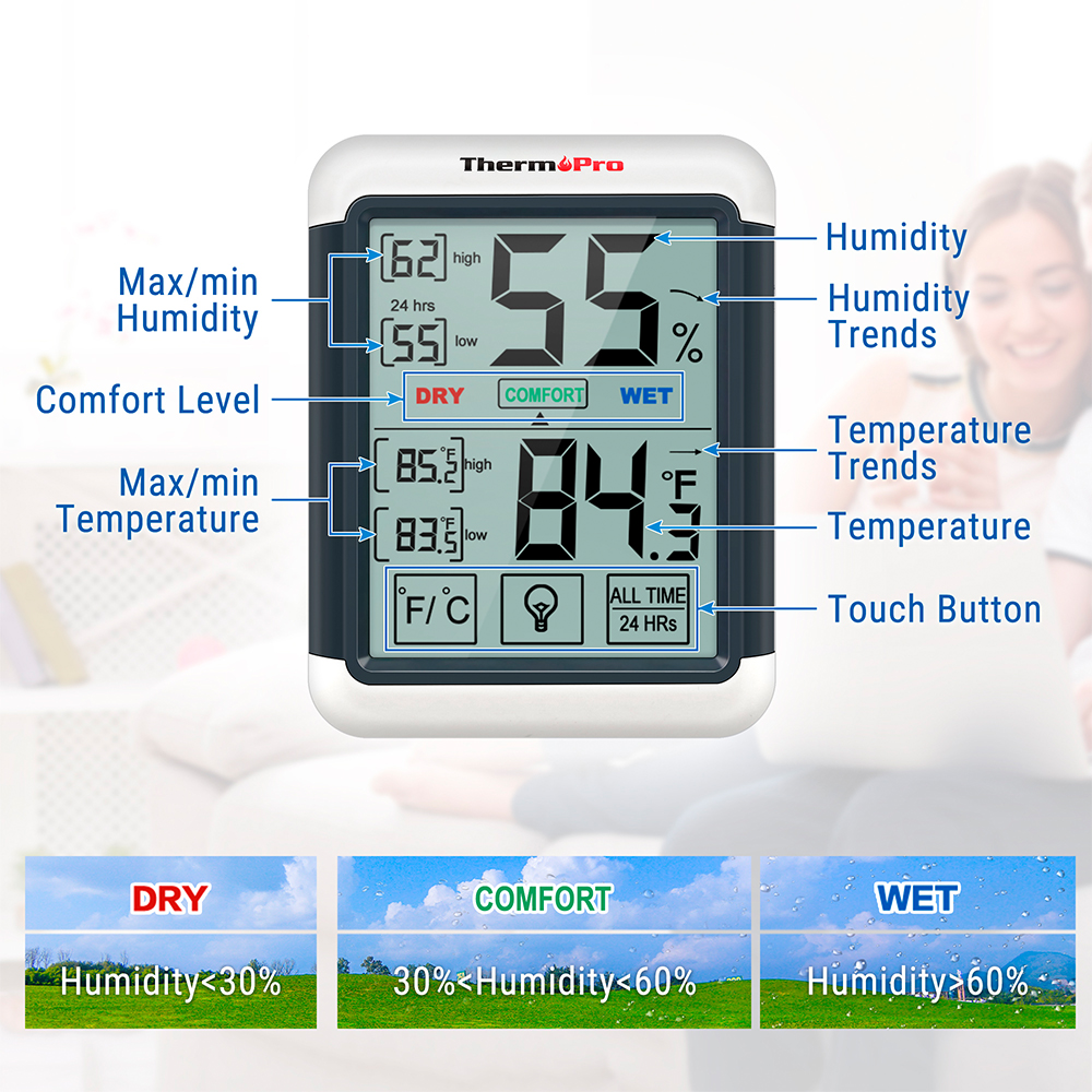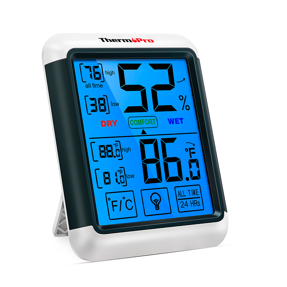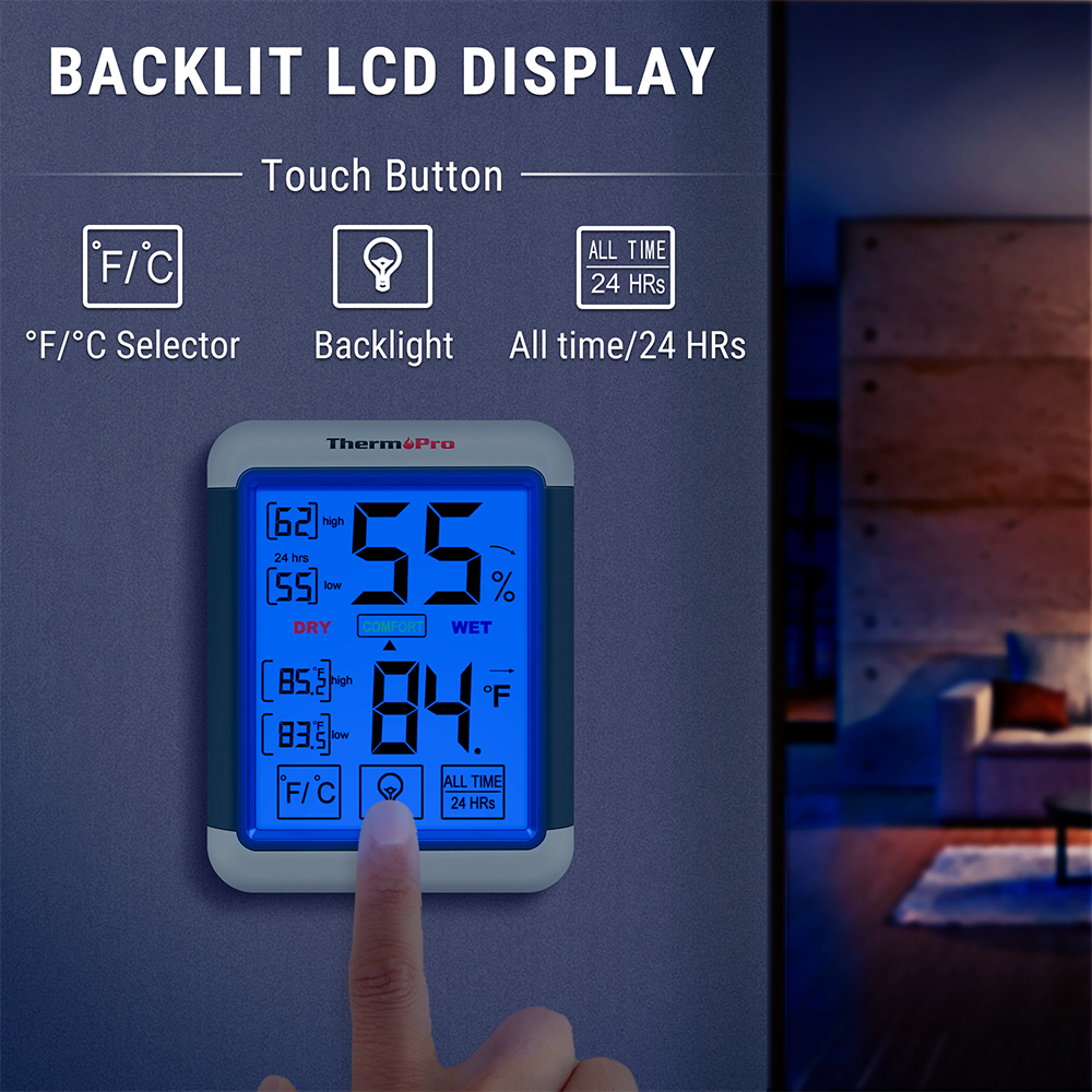ThermoPro TP55 Higrômetro Termômetro Digital Interno com Display Touchscreen Grande, Medidor de Umidade e Temperatura Ambiente para Casa, Quarto e Escritório, Luz de Fundo e Registro Máx/Mín