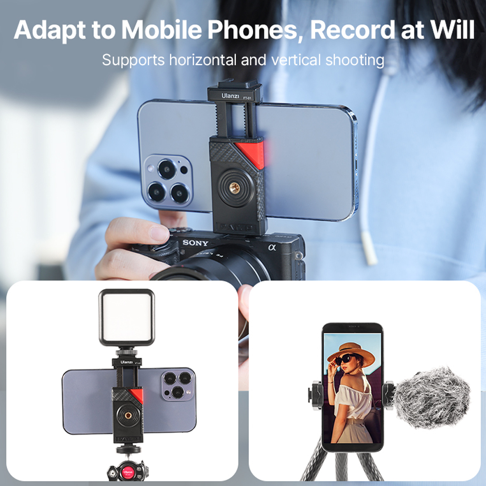 Equipado com parafuso universal de 1/4″ e clipe para telefone, suporta câmeras DSLR, mirrorless e celulares, além de incluir sapata fria para acessórios como microfones e luzes LED.