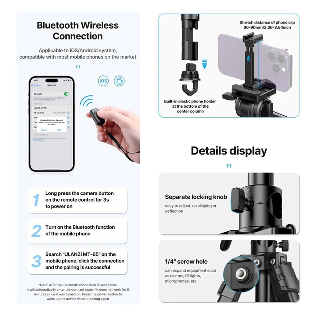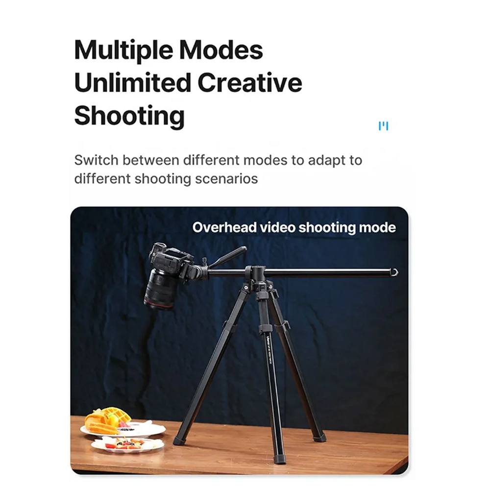 1. Estrutura Versátil com Eixo Horizontal: O Tripé Ulanzi MT-65 possui uma coluna central inovadora que pode ser montada horizontalmente, permitindo ângulos de filmagem suspensa e zenital ideais para tutoriais, culinária e produções criativas de alta qualidade.