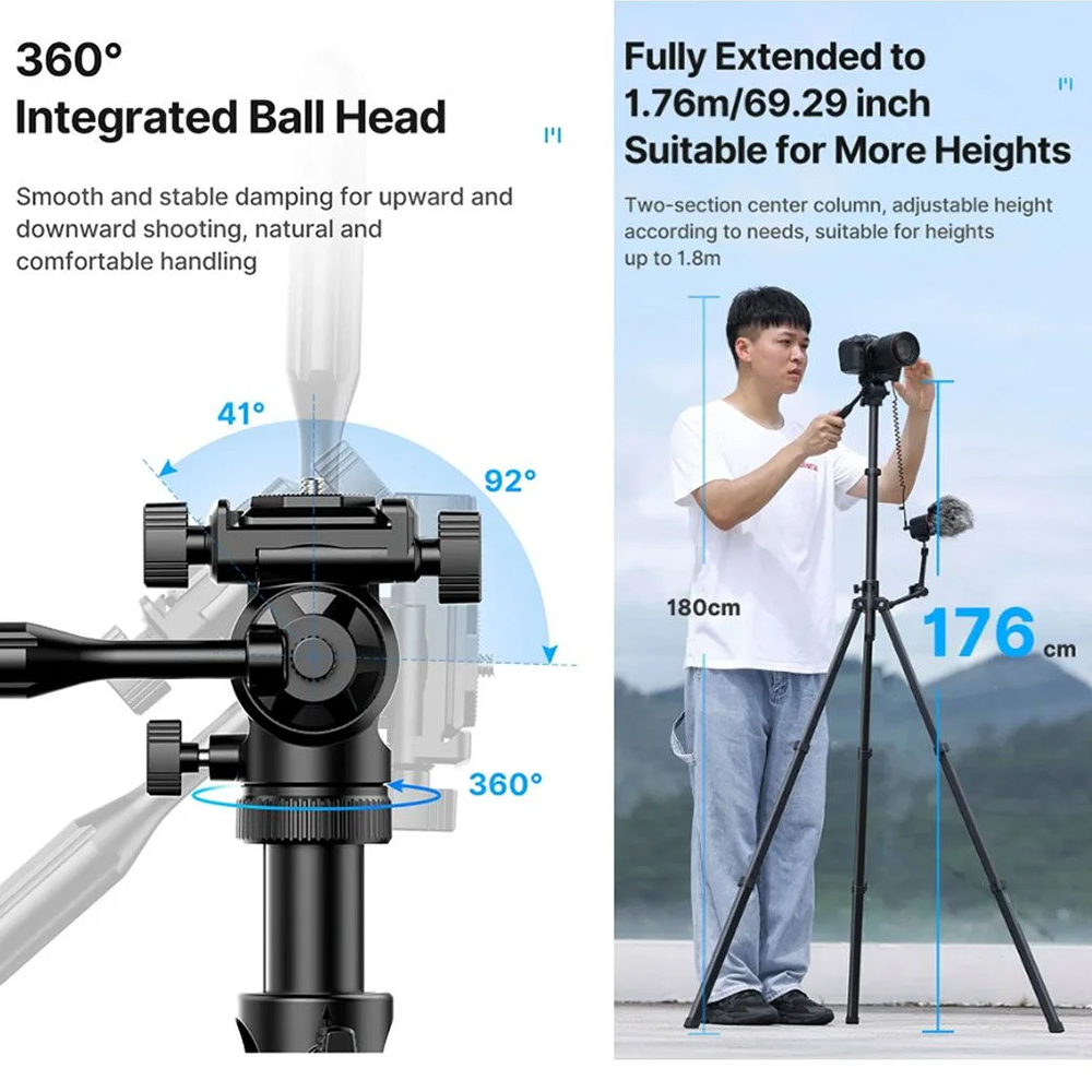 2. Altura Ajustável e Alcance Profissional: Com extensibilidade máxima de 1,76 metros e coluna central de duas seções, este suporte oferece flexibilidade total para diferentes cenários, desde capturas baixas a 53 cm até gravações em altura de visão humana.
