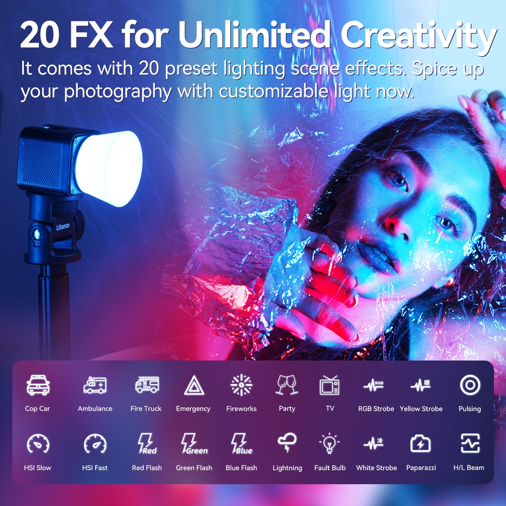 3. Cores Vibrantes e Efeitos Criativos: Explore um espectro completo de cores RGB para personalizar a atmosfera de suas produções. O Ulanzi L3 oferece diversos modos de cor e efeitos especiais dinâmicos, como flashes e pulsos, para adicionar um toque artístico único e profissional aos seus vídeos e fotos, destacando seu conteúdo.