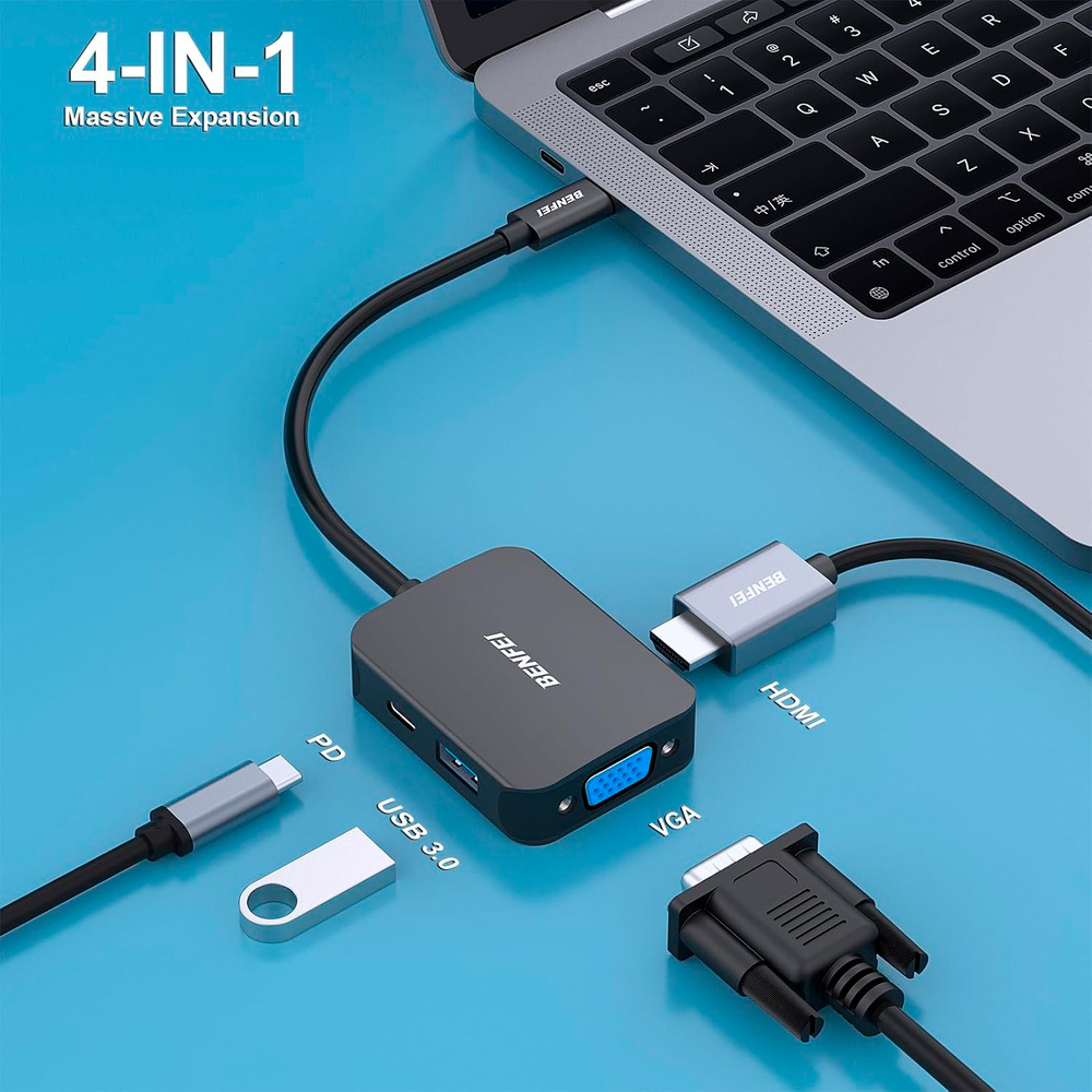 Benfei Hub Usb C 4 Em 1 para Hdmi, Usb A/C, Vga Preto